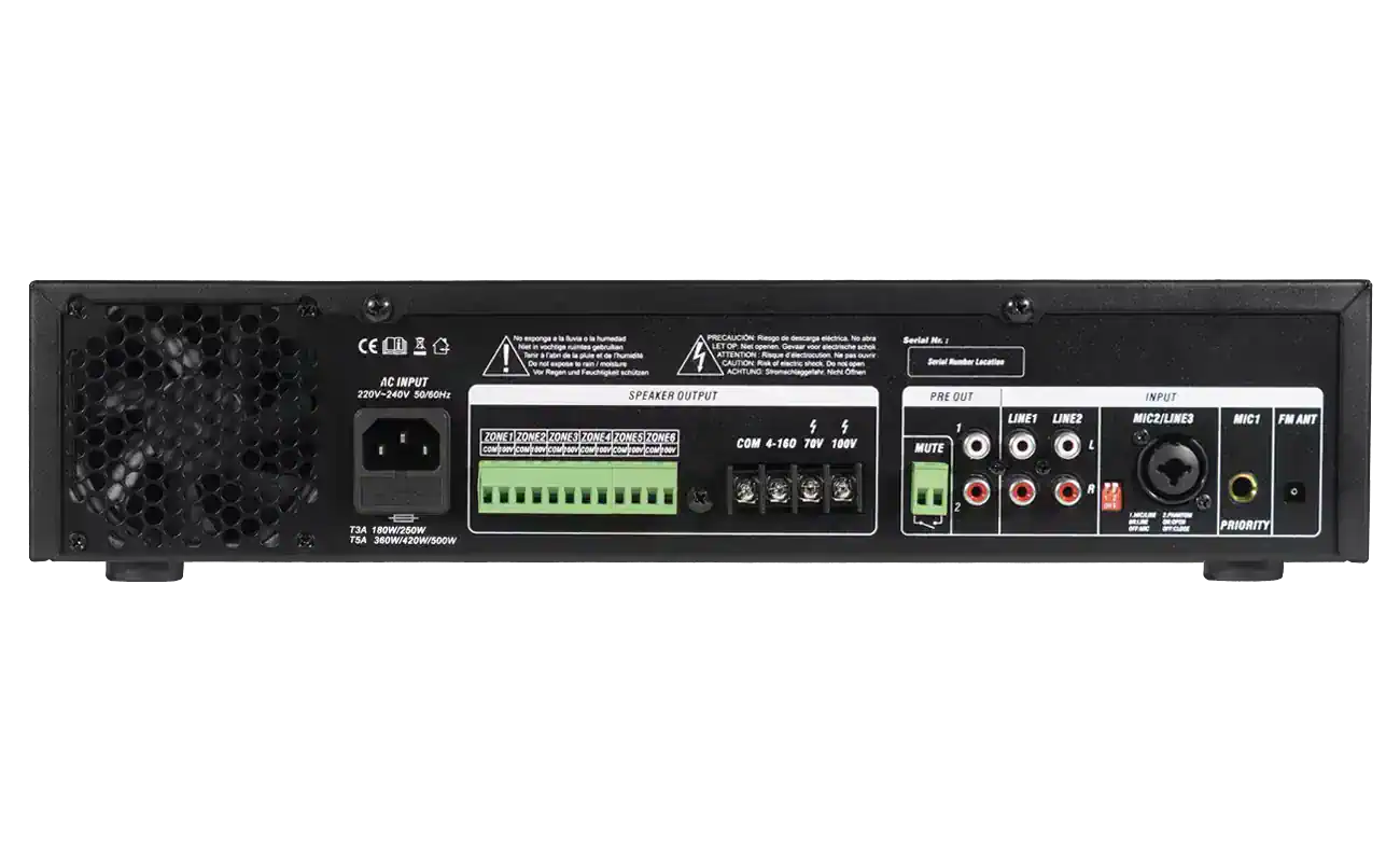 Profesionálny inštalačný zosilňovač s výkonom 500 W určený pre ozvučenie komerčných a verejných priestorov. Umožňuje rozdelenie zvukového systému až na 6 nezávislých zón, takže môžete v rôznych miestnostiach prehrávať odlišnú hudbu alebo hlásenia