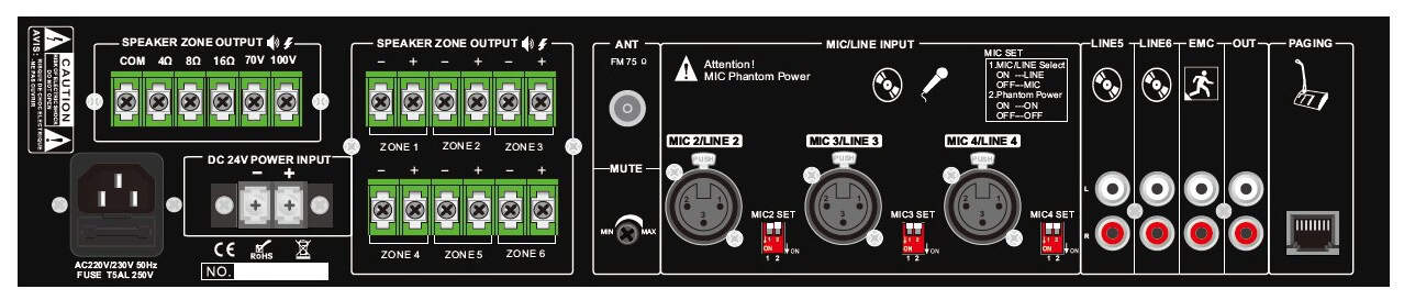 6 zónový mixážny zosilňovač s MP3/USB/FM tunerom/Bluetooth, 240 W, je ideálny pre vyhlasovanie a prehrávanie podmazovej hudby v školách, super marketoch, bankách a hoteloch. All in one riešenie s 6 vstupovým mixom a výkonovým zosilňovačom v jednej 19“ jednotke s výškou 2U. 1 mikrofónový vstup (6,3mm jack), 3 mono vstupy prepínateľné mikrofon/linka (XLR), 2 linkové stereo vstupy, jeden EMC vstup a jeden RJ45 vstup pre 6 zónový diaľkový vyhlasovací mikrofón. Prehrávač s USB a SD slotom na prednej strane. Zosilňovač je navrhnutý s kompletnou ochranou proti preťaženiu, skratu a vysokej teplote, aby sa zabránilo akémukoľvek poškodeniu.